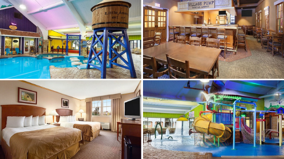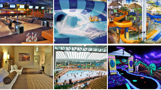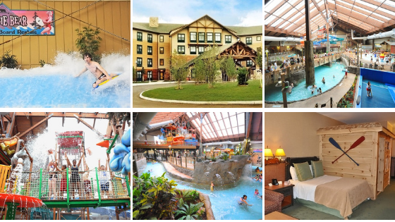 This hotel has both indoor and outdoor water parks with 24 water slides, rides, and river systems. Water park passes for four are included with some options.